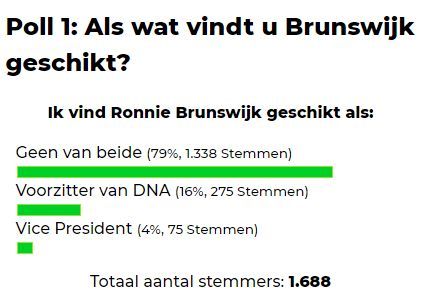 Of het u zal verbazen is niet zeker, maar 1338 van de 1288 personen, een niet zuinige 70%, vindt Brunswijk noch als DNA voorzitter, noch als Vicepresident een geschikte kandidaat. De eerste is hij al, de tweede kan hij worden! 16% van de stemmers vindt hem wel goed genoeg als DNA voorzitter, 275 personen dus, en slechts een heel magere 4% of 75 personen achten hem geschikt als VP. Heeft u er ook een mening over?