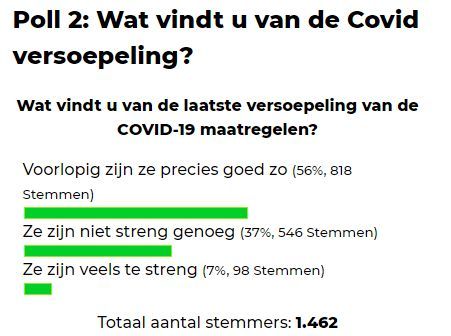 De meeste mensen, 56% of 818 van de 1462 stemmers, vinden de maatregelen precies goed zoals ze nu zijn, dus: men is er merendeels wel tevreden over. Maar er zijn ook mensen, in deze peiling zijn dat er 546 personen of 37%, die ze toch niet streng genoeg vinden, en dus niet zo gelukkig zijn met de versoepelingen. Een kleine 7%, slechts 98 personen, vindt de maatregelen zoals ze nu zijn nog veels te streng. De echte vraag is: blijven ze zo, worden ze strenger, of kunnen we meer versoepelingen tegemoet zien? Wat denkt u zelf?
