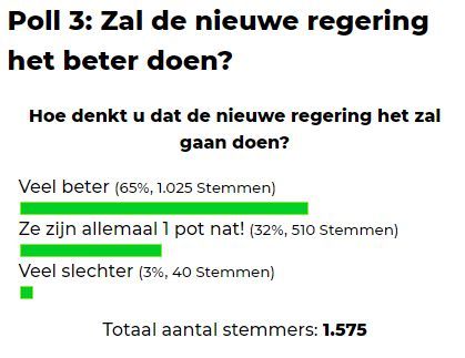 OOk niet verbazingwekkend, gezien de verkiezingsresultaten, maar 65% van de 1575 stemmers, dat zijn er meer dan 1000 personen, geloven (of hopen?) stellig dat de nieuwe regering een betere beurt zal maken, terwijl 32% of 510 personen, dus zeker een derde, van mening is dat alle regeringen toch maar 1 pot nat zijn – daaruit mogen we concluderen dat men niet erg veel geloof heeft dat het beter zal worden. Een heel marginale minderheid van 3% of 40 personen denkt toch dat de nieuwe regering het veel slechter zal doen, maar: dat hoopt niemand he?