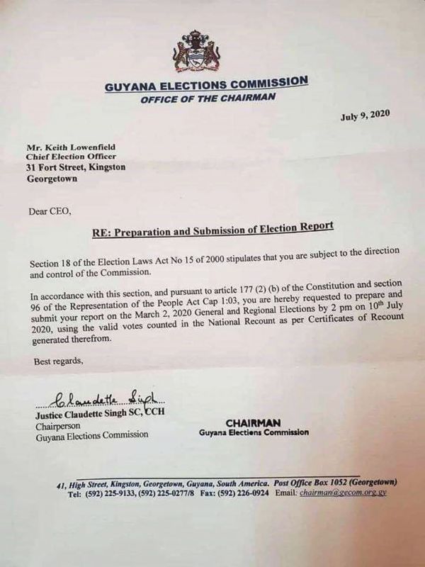 GECOM-voorzitter Claudette Singh schreef Lowenfield gisteren de deadline voor het rapport dat aangeeft dat ze van plan is zich te houden aan de uitslag van de hertelling.