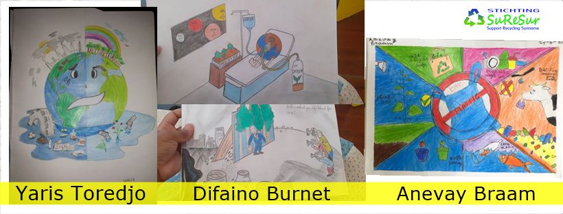 Yaris Toredjo (1e plaats), Difaino Burnet (2e plaats) en Anevay Braam (3e plaats) zijn de winnaars van de tekenwedstrijd die de Stichting Support Recycling Suriname (SuReSur) heeft georganiseerd voor de zesde klassers van de lagere school.