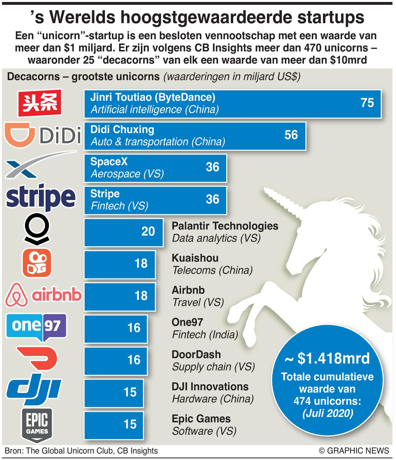 Een “eenhoorn” startup is een particulier bedrijf met een waardering van meer dan 1 miljard dollar. Er zijn meer dan 470 eenhoorns — met inbegrip van 25 ,,decacorns” die op meer dan $10bn elk, volgens bedrijfsanalysebedrijf CB Insights worden getaxeerd.