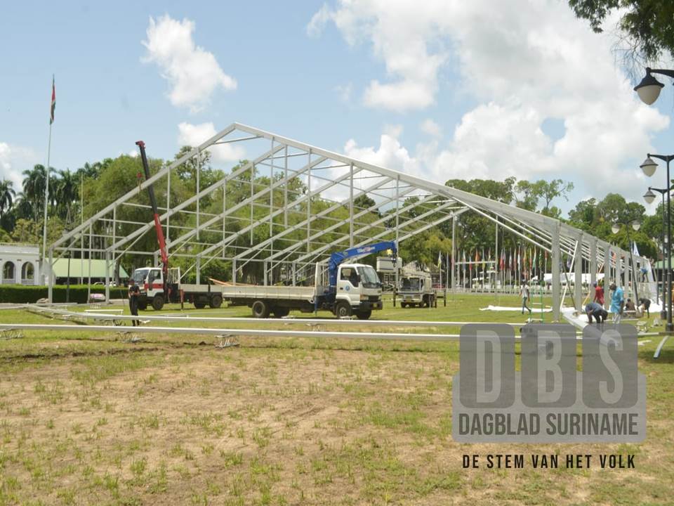 Chandrikapersad Santokhi en Ronnie Brunswijk zijn gekozen tot respectievelijk president en vicepresident van de Republiek Suriname. De machtsoverdracht vindt in besloten kring op donderdag 16 juli plaats op het Onafhankelijkheidsplein. De voorbereidingen daartoe zijn in volle gang. (foto: Regilio Derby)