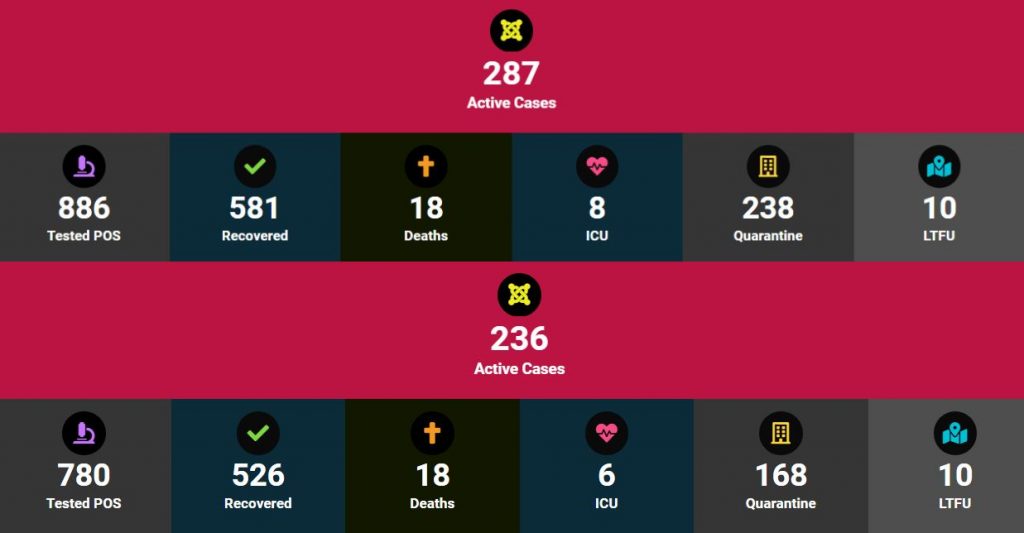 Er zijn op dit moment 287 actieve gevallen en 886 positieve. 581 personen staan vermeld als genezen, terwijl er gelukkig nog “slechts” 18 doden gevallen zijn tengevolge van het virus. Er liggen nu 8 mensen op de IC, twee meer dan bij de laatste vermelding, 238 personen in quarantaine en nog altijd 10 vermeld als Loss to Follow Up (LTFU).