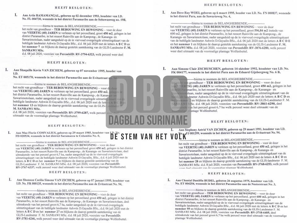 Noersalim was minister van Binnenlandse Zaken. De beschikkingen zijn getekend op 14 juli, nadat de landmeterskaart op 6 juli werd vervaardigd en de Glis-landmeter zich haastte om alle deze 12 personen binnen 2 dagen van een perceel-ID te voorzien. Alle beschikkingen hebben een LAD no. van 2020, hetgeen betekent dat al deze verzoeken dit jaar zijn gedaan. Dit is vooral vreemd bij de aanvraag van Shannon Van Zichem, aangezien deze houder van het recht van grondhuur op 7 januari 2020 pas 21 jaar is geworden. Heeft zij gelijk de dag erna het verzoek dan ingediend en is dit binnen 6 maanden gehonoreerd, terwijl iedereen wat voor een drama het is om het recht van grondhuur te verkrijgen. Wachttermijnen van 10 jaar en meer is normaal. Ook perceel-ID’s hebben een enorme achterstand, behalve voor deze 12 aanvragers, want voor hen kon de Glis-landmeter binnen 2 dagen een perceel-ID opmaken. Overigens valt het op de mejuffrouw Shannon Van Zichem slechts 1 van de gelukkigen is in dat gezin. Ook haar broer en zus kregen een beschikking voor Cultuurtuinlaan. Net zo gelukkig was de familie Zschuschen, waar ook 2 zusters in aanmerking kwamen voor het recht van grondhuur.