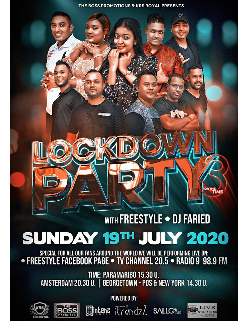 The Boss Promotions & KRS Royal hebben het initiatief genomen om wederom via het digitaal platform een “Lockdown Party” te organiseren. De organisatie noemt het de “Lockdown Party 3”. Het publiek kan middels het digitale platform genieten van de muziekformatie FreeStyle en Dj Faried. Het wordt een optreden voor alle muziekliefhebbers. Deze party op het digitaal platform staat gepland voor zondag 19 juli aanstaande. De kijkers mogen een heel feestelijke sfeer verwachten. De muziekformatie is geen onbekende binnen ons muziekwereld met als zangers Amrish Persaud, Sathyam Matadin, Sharon Ravenberg en Neelam Matadin. De muzikanten zijn Karan Mathoera (bandleider), Sunny Rambali, Sanjay Soekha, Kenny Amatmoekri en Rowien Doebar. Dj Faried heeft ook zijn eigen stijl en is populair binnen de muziek scene onder de disc jockeys in ons land. De organisatie neemt wederom het initiatief omdat uit ervaring gebleken is dat de vraag naar ontspanning door het publiek heel groot is..