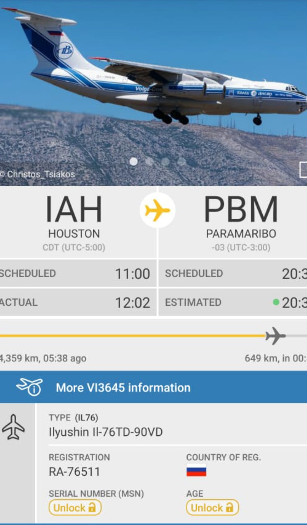 Momenteel vliegt een zwaar vrachtvliegtuig vanuit Amerika om naar verluidt de Russische helikopter in Suriname op te halen. De helikopter, een Mil Mi-17 zware transport helikopter is sinds begin februari van het jaar in ons land. Het verblijf daarvan bleef aldoor onder mysterieuze omstandigheden. Informatie omtrent het toestel bleef schaars. Voormalig minister van Volksgezondheid Antoine Elias gaf destijds aan dat het toestel voor ontwikkeling van het binnenland was. Echter werd het toestel ingezet voor het voeren van politieke propaganda, met name het verdelen van de beruchte paketten door de NDP. Na de verkiezingen gaf huidige President Chan Santokhi aan dat er juridische kwesties speelden en dat het toestel niet meer inzetbaar was voor hulpverlening bij de covid-crisis in het binnenland. Nu blijkt dat het toestel wordt opgehaald door een Russisch transport vliegtuig.