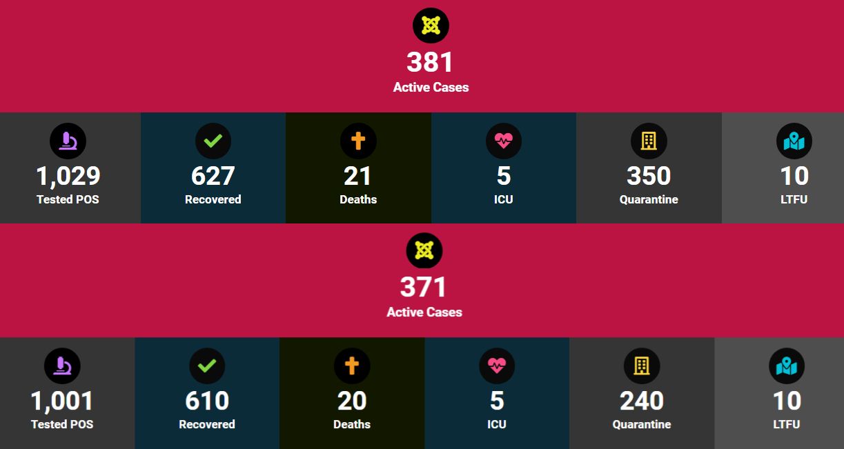 Het aantal actieve cases staat nu op 381, 10 meer dan gisteren. Er zijn reeds 627 personen genezen verklaard, dat stuk is altijd aangenamer nieuws, en er zijn nu 350 personen in quarantaine, ruim 100 meer dan gisteren.