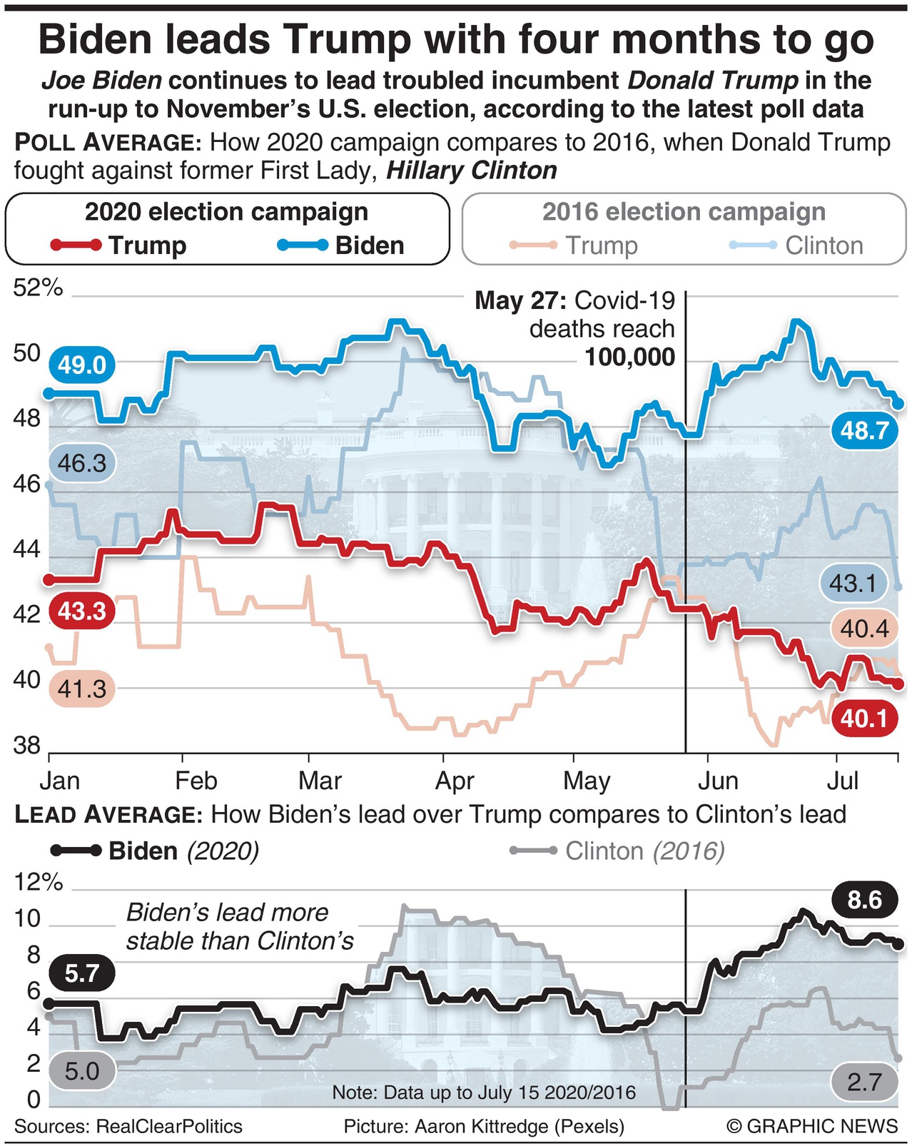 Joe Biden blijft de verontruste zittende Donald Trump leiden in de aanloop naar de Amerikaanse verkiezingen in november, volgens de laatste opiniepeilingen.