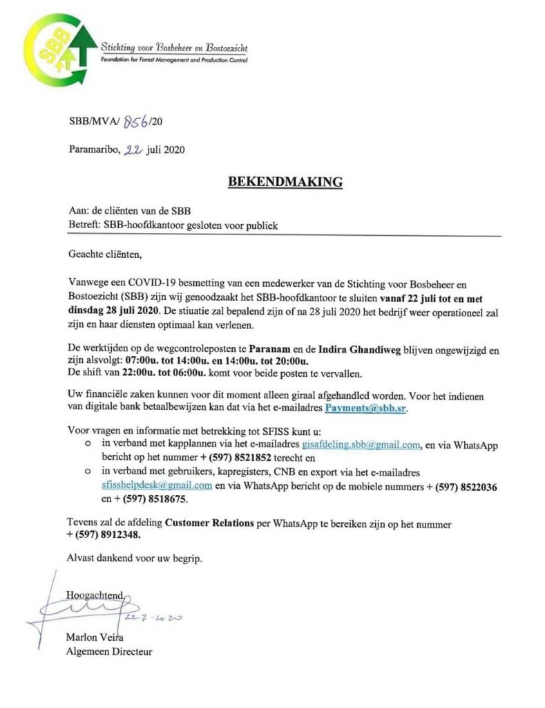 Vanwege een COVID-19 besmetting van een medewerker van de Stichting voor Bosbeheer en Bostoezicht (SBB) zijn wij genoodzaakt het SBB-hoofdkantoor te sluiten vanaf 22 juli tot en met dinsdag 28 juli 2020. De situatie zal bepalend zijn of na 28 juli 2020 het bedrijf weer operationeel zal zijn en haar diensten optimaal kan verlenen.