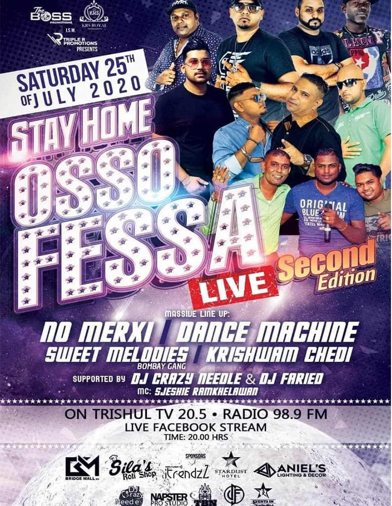 The Boss Promotions & KRS Royal in samenwerking met Triple R Promotions organiseren de 2de editie van Stay Home Osso Fessa op het digitaal platform. De eerste editie is succesvol geweest. De organisatie en leden van de muziekgroepen hebben zelfs telefoontjes ontvangen van fans/ muziekliefhebbers om ter plekke aanwezig te zijn, maar helaas is dit slechts digitaal te volgen, gezien de situatie. Het geheel staat gepland voor zaterdag 25 juli. Ook deze organisatie neemt de covid maatregelen in acht. Het publiek mag dit keer genieten van optredens door muziekformaties Dance Machine, No Merxi, Sweet Melodies Bombay Gang, Dj Crazy Needle, Dj Faried, Krishwam Chedi. De kijkers mogen zoals de naam Stay Home Osso Fessa, een heel feestelijke sfeer verwachten. De organisatie heeft als doelstelling om ondanks alles voor entertainment te zorgen.