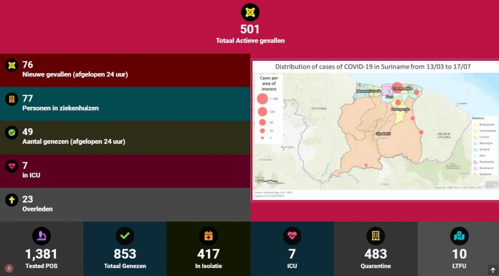 In totaal zijn in Suriname tot nog toe 1381 personen positief getest, wat neerkomt op pakweg 0.2% van de totale surinaamse bevolking. 853 van de 1381 personen die besmet raakten zijn reeds genezen, dus haast 62% is reeds genezen verklaard.