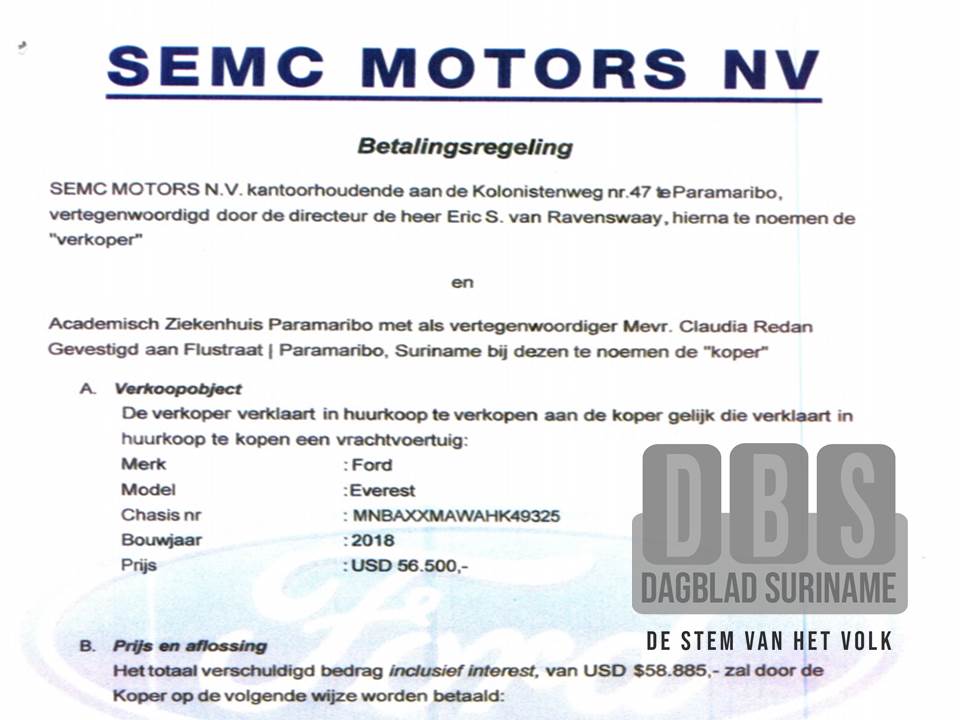 Met het aantreden van de regering Santokhi/Brunswijk rijzen als paddenstoelen naar boven de vele misstanden die zich de afgelopen tien jaren hebben voltrokken tijdens regering Bouterse. In de rij van de vele uitgaven circuleert thans op social media de koopovereenkomst die de directeur van AZP, Claudia Redan, heeft gesloten met het bedrijf SEMC voor de aankoop van een splinternieuwe auto ter waarde van USD 56.500.