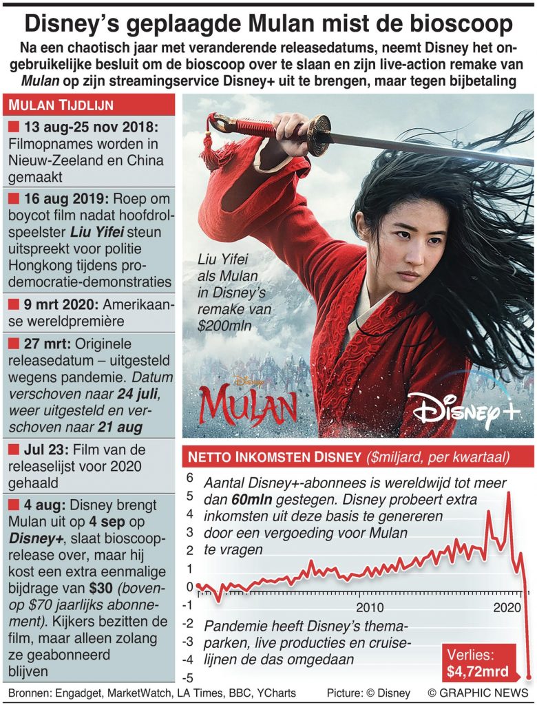 De film Mulan van Disney komt niet in de bioscoop. De live-actionfilm gaat in première op streamingdienst Disney+. Wie de film wil zien, moet wel betalen, heeft Disney aangekondigd.