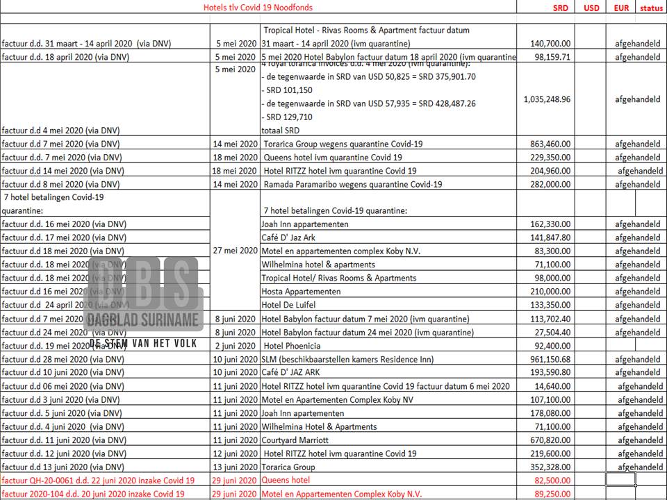 Uit de SRD 400 miljoen voor het Noodfonds die tijdens de regering Desi Bouterse-Ashwin Adhin werd goedgekeurd om de kosten voor Covid-19 en te bekostigen, heeft de regering een totale rekening voor hotelkosten gepresenteerd gehad van SRD 9.331.542,95. Hiervan moet SRD 3.132.625,08 nog worden betaald. Dat blijkt uit stukken waarop Dagblad Suriname de hand heeft weten te leggen. Sinds de constatering van het eerste Covid-19 geval in Suriname, hebben autoriteiten verschillende locaties, waaronder hotels ingezet om potentiele besmette personen, waaronder ook repatrianten, in verplichte overheidsquarantaine te plaatsen. Hiervoor zijn zelfs de meest luxe hotels in Suriname, waaronder Royal Torarica, Torarica Group en Ramada ingezet. Al deze kosten worden volledig door de overheid gedragen. De hoogste betaalde rekening is op 4 mei 2020 via het Directoraat Nationale Veiligheid binnengekomen en is van Royal Torarica. Het gaat hier om 4 rekeningen, waaronder SRD 375.901,70 (tegenwaarde in SRD van USD 50,825), SRD 101,150, SRD 428.487,26 (tegenwaarde in SRD van USD 57,935) en SRD 129,710. In totaal gaat het om een bedrag van SRD 1.035.248,96 . Op 10 juni is een bedrag van SRD 961.150, 68 aan de SLM betaald voor het beschikbaar stellen van kamers in Residence Inn. Opvallend genoeg staat nog eens een betaling van boven de SRD 1 miljoen te wachten bij nog een luxe hotel. Daarvoor zal de regering Santokhi-Ronnie Brunswijk moeten opdraaien.