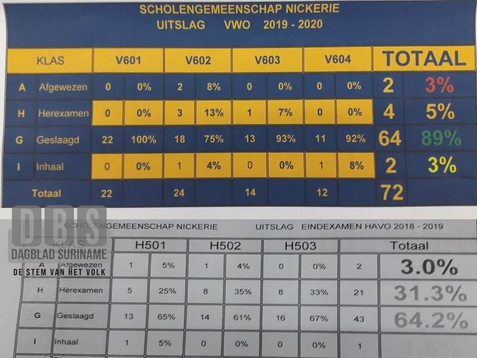 Ook op de Scholengemeenschap Nickerie (SGN) heeft Covid-19 geen roet in het eten gegooid. Van de 72 vwo-examenkandidaten zijn 64 geslaagd (89%), 4 hebben een herkansing (5%), 2 zijn afgewezen (3%) en 2 hebben inhaalexamen (3%). Van de 60 Havo-examenkandidaten zijn 42 geslaagd (70%), 17 hebben een herkansing (28%) en 1 is afgewezen (2%). Vorig jaar bedroeg het voorlopig slagingspercentage op het vwo 83.7% en op de Havo 64.2%.
