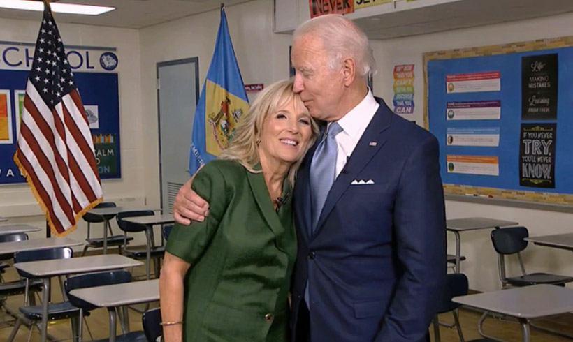 Biden nam de nominatie in ontvangst in bijzijn van zijn vrouw Jill, die in het geval van winst na januari first lady wordt.