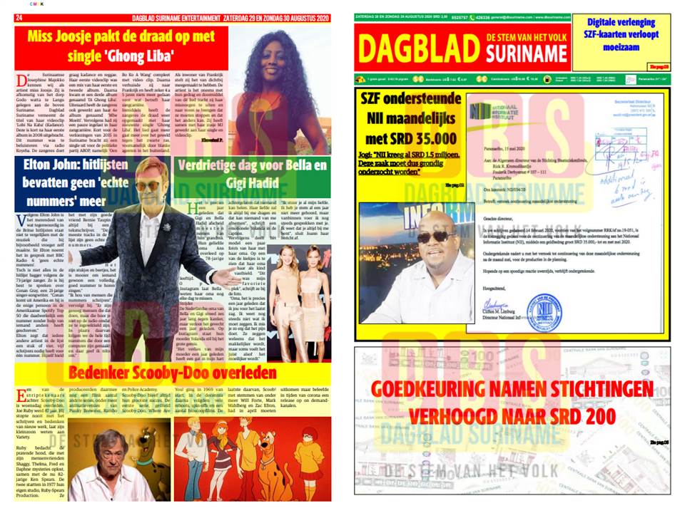 Krant zaterdag 29 en zondag 30 augustus 2020 Geplaatst op augustus 29, 2020augustus 28, 2020 U kunt de krant van zaterdag 29 en zondag 30 augustus hieronder downloaden in .pdf formaat…. https://we.tl/t-bvqovGabQV Bericht navigatie Vorige55 Nieuwe Covid-19 besmettingenVolgendeJogi: “NII kreeg al SRD 1.5 miljoen. Deze zaak moet dus grondig onderzocht worden”