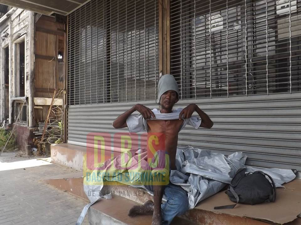 Zwerver Steve in een adem door: “Waarom kijken mensen niet naar mij om. Ben ik zo slecht? Ik ben ziek, mijn familie heeft mij verstoten. Ik voel mij niet goed, ik kan niet meer. Heeft u wat voor mij om eten te kopen? Mi e dede langzaam tapu a strati”.