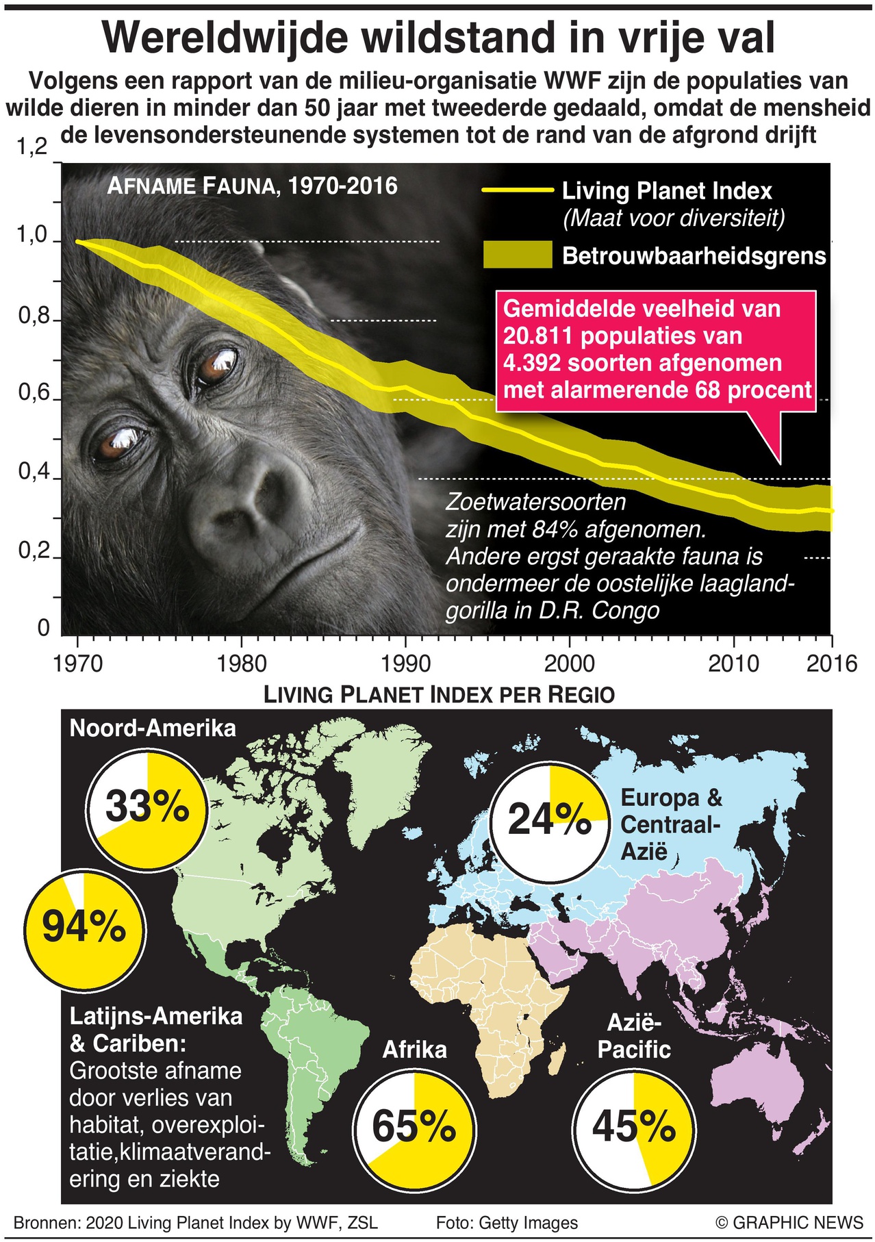 In het “Living Planet Report” maakt het WWF om de 2 jaar een stand van zaken op van de biodiversiteit op onze planeet. In het vorige rapport had het WWF berekend dat tegen dit jaar 67 procent van de dieren verdwenen zou zijn. Maar dat cijfer was in werkelijkheid al in 2016 achterhaald, zo blijkt uit het nieuwe rapport.