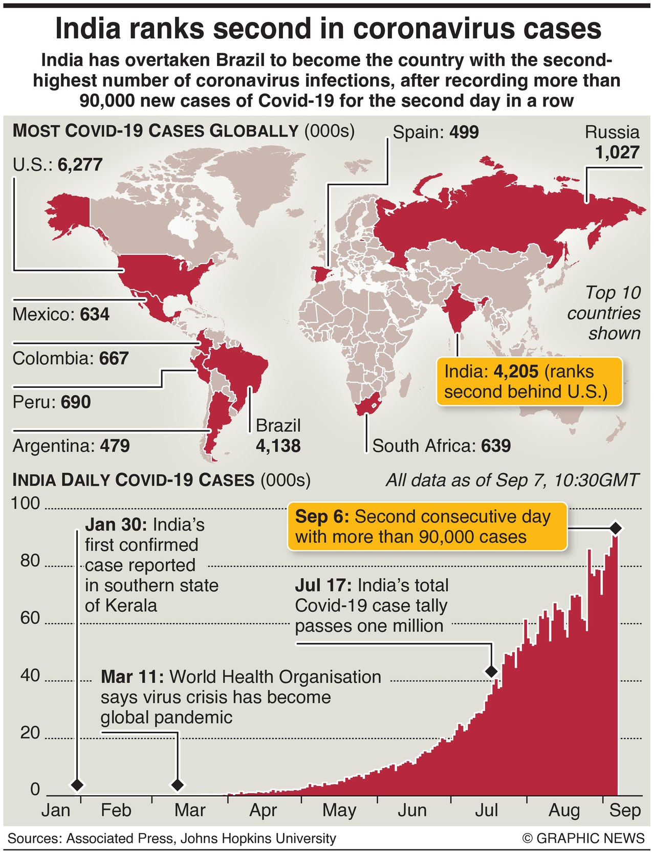 Desondanks boekte India een recordaantal bevestigde besmettingen in één dag, 90.632, het hoogste aantal ter wereld. Daarmee zou het aantal besmettingen wereldwijd boven de 27 miljoen zijn gekomen. Het werkelijke aantal ligt waarschijnlijk veel hoger, onder meer omdat er niet overal op dezelfde manier wordt getest.