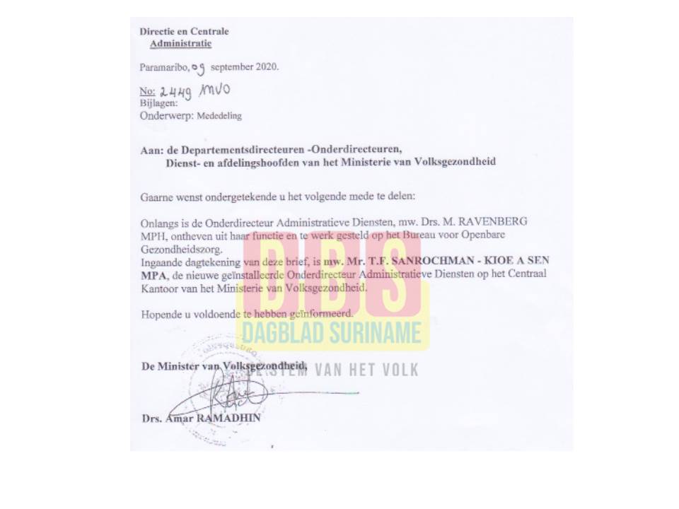 De minister van Volksgezondheid, Amar Ramadhin, heeft de onderdirecteur Administratieve Diensten, M. Ravenberg, woensdag ontheven uit haar functie. Zij is thans te werk gesteld op het Bureau voor Openbare Gezondheidszorg. De plek van Ravenberg is ingenomen door T. Sanrochman- Kioe A Sen. Alle medewerkers van het ministerie zijn schriftelijk op de hoogte gebracht van deze ontheffing.