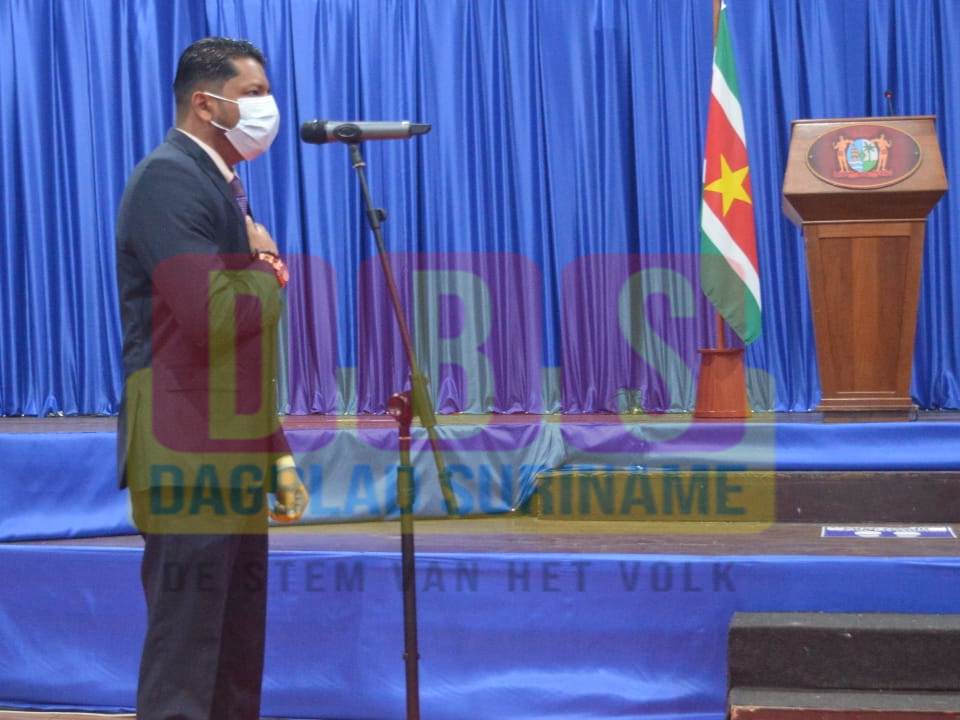 Amzad Abdoel, gewezen NDP-fractieleider in het parlement en ook nog gewezen voorzitter van de vaste parlementaire commissie Financiën, is gisteren beëdigd als lid van de Staatsraad. Abdoel, die bij de afgelopen verkiezingen met 117 stemmen grandioos door de kiezers in Wanica is afgewezen, is voorgedragen door de Nationale Democratische Partij (NDP). Abdoel heeft zich enorm impopulair gemaakt door steeds de regering Bouterse te beschermen tegen haar financiële wanbeleid en alles wat krom ging, goed te spreken. Zo staat hij bekend om zijn uitspraken, waarbij hij meerdere malen voor de verkiezingen van 2015 de verzekering heeft gegeven dat de Surinaamse munt nimmer een devaluatie zou krijgen. Wat wij uiteindelijk wel kregen, is een zware devaluatie met ruim 400%. (foto: Regilio Derby – tekst: FR)