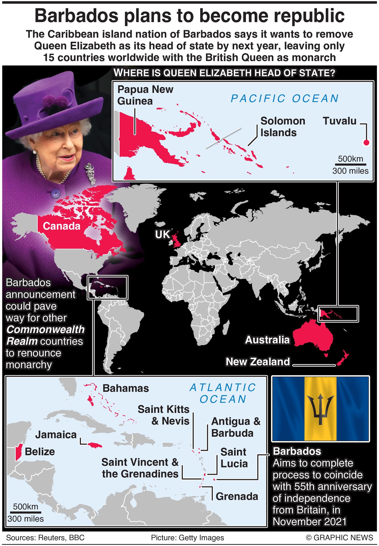 In addition to Barbados and the UK, Queen Elizabeth II currently serves as the Head of State of Antigua and Barbuda, Australia, Bahamas, Belize, Canada, Grenada, Jamaica, New Zealand, Papua New Guinea, Saint Kitts and Nevis, Saint Lucia, Saint Vincent and the Grenadines, Solomon Islands and Tuvalu.