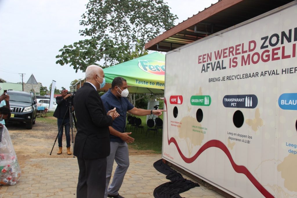 Minister Silvano Tjong-Ahin van Ruimtelijke Ordening en Milieu en directeur Bryan Renten van de Fernandes Bottling Company namen officieel het eerste recycling center te Meerzorg, nabij de rotonde bij kantoren van de SWM en RGD, in gebruik.