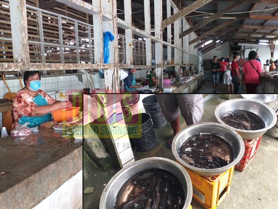 In gesprek met Dagblad Suriname geven enkele visverkopers op de markt van Nieuw Nickerie aan dat de visverkoop flink is afgenomen in de afgelopen maanden. Dit is in grote mate te wijten aan de uitbraak van het Coronavirus in ons land en de beperkingen die daaraan gekoppeld zijn. Echter speelt de financieel-economische crisis die ook al maanden voortsleept een steeds grotere rol. “De lokale bewoners kopen veel minder nu, merken we. De Coronavirus- pandemie heeft alles verergerd. Toeristen van Nederland en Europa zien wij niet meer. Maar ook stedelingen zagen we steeds minder door de lockdown in het weekend. Tot ernst van de ramp was er ook nog een Covid-geval op de markt, waardoor die gesloten was. De prijzen zijn relatief stabiel gebleven, stelt de verkoper. We proberen toch zoveel mogelijk te verkopen. Hopelijk wordt de crisis aangepakt, want dat maakt ons leven héél moeilijk. Coronavirus heeft beperkingen gebracht ja, maar als mensen hun geld waarde heeft, kunnen zij kopen. Dan kunnen wij op ons beurt onze gezinnen verzorgen. Voorlopig gaat het slap mang”, verzucht de marktverkoper te Nieuw Nickerie.