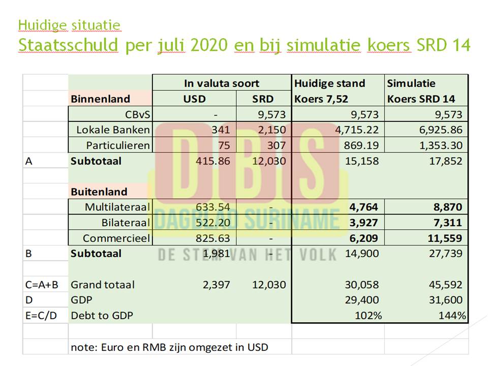 Volgens een cashflow-projectie tot eind 2021 is de impact van een koersaanpassing van SRD 7,52 naar SRD 14 minimaal, omdat dat niet zoveel invloed heeft op de kastekorten bij de overheid aangezien zowel de uitgaven als de ontvangsten van de overheid zullen stijgen. Echter zal de koersaanpassing het probleem niet oplossen. “In geen enkel maand is er sprake van een overschot waarmee je het tekort van de volgende maand mee kunt dekken. Noch geheel noch gedeeltelijk. Alle balken wijzen naar beneden toe, geen één wijst naar boven toe”. Volgens hem moet duidelijk zijn dat de koers van SRD 7,52 niet meer te handhaven is.