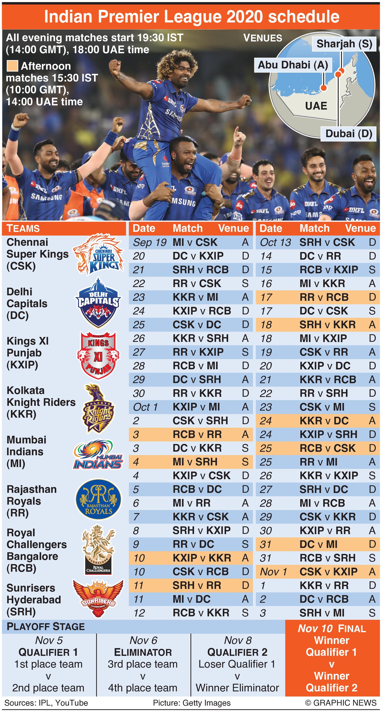 The 60-match tournament will take place without spectators at three “bio-secure” venues – Sheikh Zayed Stadium in Abu Dhabi, Sharjah Cricket Stadium and the Dubai International Cricket Stadium.