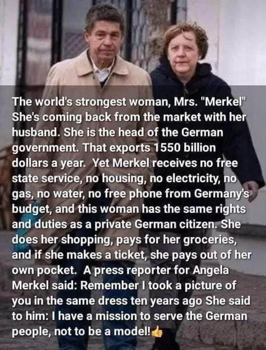 “De sterkste vrouw in de wereld, mevrouw Merkel, keert terug van de markt met haar man. Ze leidt de Duitse regering, die jaarlijks voor 1.550 miljard dollar exporteert. Toch ontvangt Merkel geen gratis overheidsdiensten, geen woning, geen elektriciteit, geen gas, geen water, geen gratis telefoon uit het Duitse budget, en deze vrouw heeft dezelfde rechten en plichten als iedere Duitse burger. Ze doet zelf haar boodschappen, betaalt er zelf voor, en als ze een boete krijgt, dan betaalt ze die uit eigen zak. Een verslaggever vroeg Merkel: ‘Weet u nog, ik nam een foto van u gekleed in dezelfde jurk 10 jaar geleden’. Zij antwoordde hem: ‘Ik heb een missie om het Duitse volk te dienen, niet om model te zijn’.”