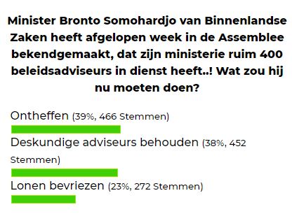 Maar wat vindt de samenleving hiervan, zo veel beleidsadviseurs op één ministerie? Uit een poll op de website van Dagblad Suriname (www.dagbladsuriname.com) blijkt woensdag dat 39% (466 stemmen) vindt dat de beleidsadviseurs zouden moeten worden ontheven. Daartegenover staat een percentage van 38% (452 stemmen) dat van oordeel is, dat alleen deskundige beleidsadviseurs uit de 400 moeten worden gefilterd om als adviseur hun werkzaamheden te kunnen blijven verrichten. 23 procent (272 uitgebrachte stemmen) vindt dat het salaris van de beleidsadviseurs moeten worden bevroren.