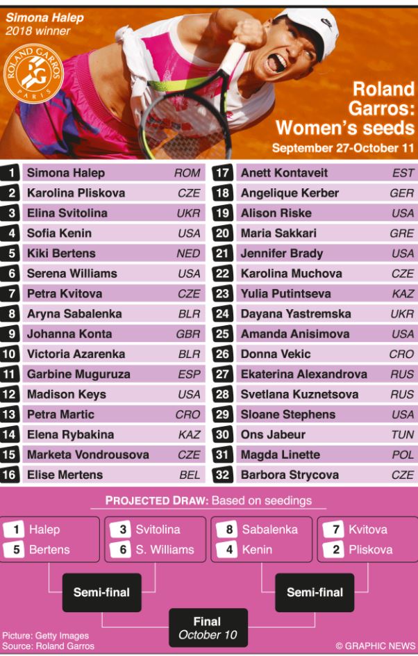2018 champion Simona Halep heads the women’s seeds at Roland Garros, having won her last two clay court tournaments in Prague and at the Premier 5 Italian Open in Rome.