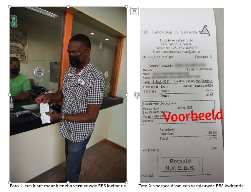 De layout en format van de EBS kwitantie die de klant bij betaling van de elektriciteitsrekening ontvangt, is kleiner dan de huidige. Op de factuur zal vanaf nu het totaal te zien zijn van de nog te betalen rekening(en). Naast de betaalde rekeningen zullen overige vorderingen, gekoppeld aan het aansluitnummer (zoals betaling nieuwe aansluiting of uitbreiding, kosten bij schade, onrechtmatig stroomverbruik etc.), telkens op de kwitantie worden vermeld.