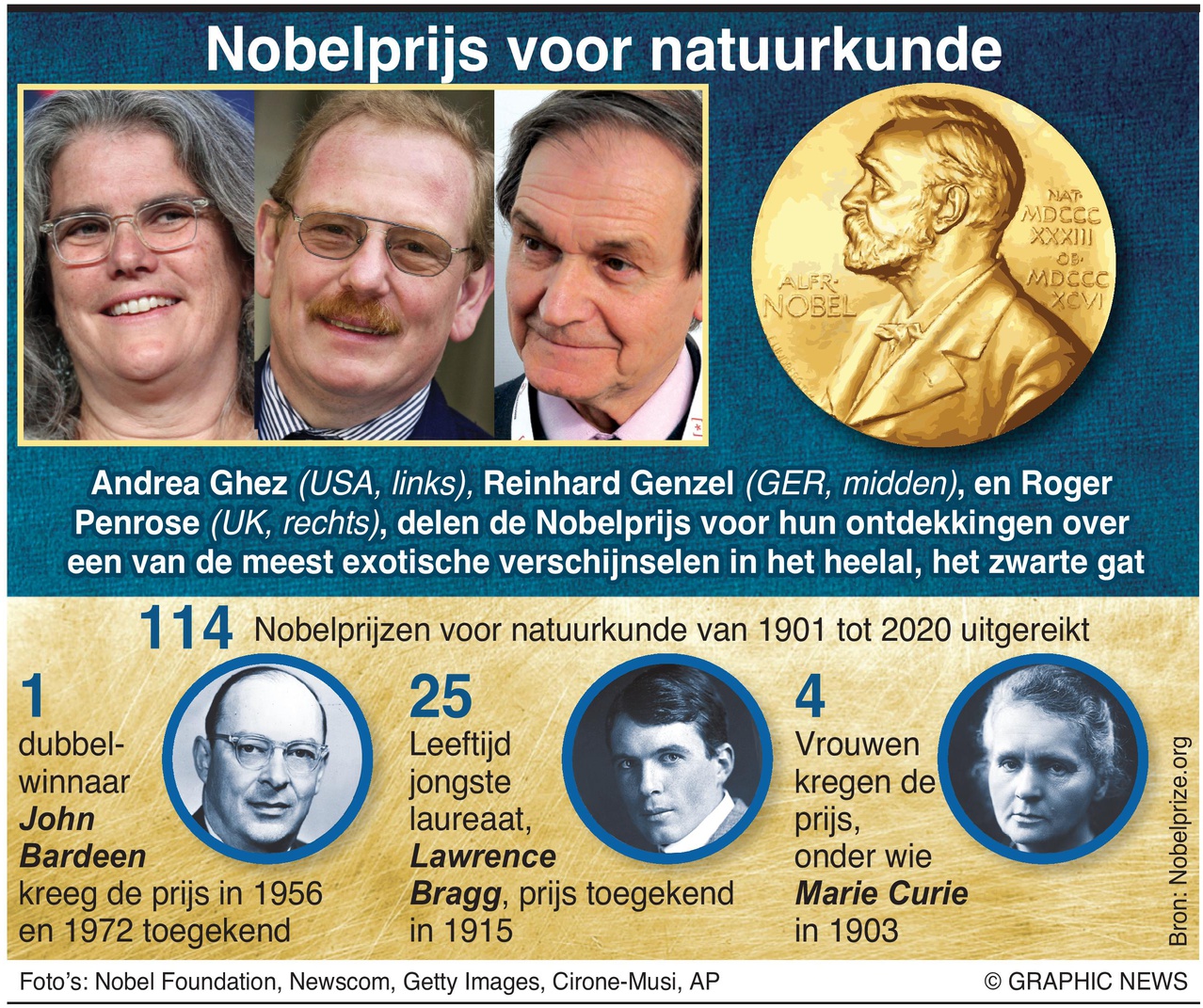 De ene helft van de Nobelprijs voor Natuurkunde 2020 gaat naar de Britse wis- en natuurkundige Roger Penrose, de andere helft gaat naar de Duitser Reinhard Genzel en de Amerikaanse Andrea Ghez.