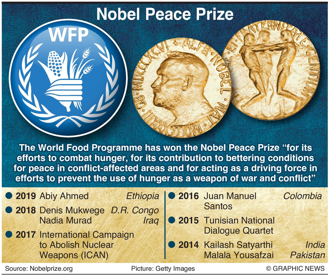 Het Wereldvoedselprogramma (WFP) van de Verenigde Naties heeft de Nobelprijs voor de Vrede ontvangen. Dat heeft het vijf leden tellende Noorse Nobelcomité vrijdag bekendgemaakt. De prijs, goed voor omgerekend €935.000, wordt op 10 december in Oslo uitgereikt.