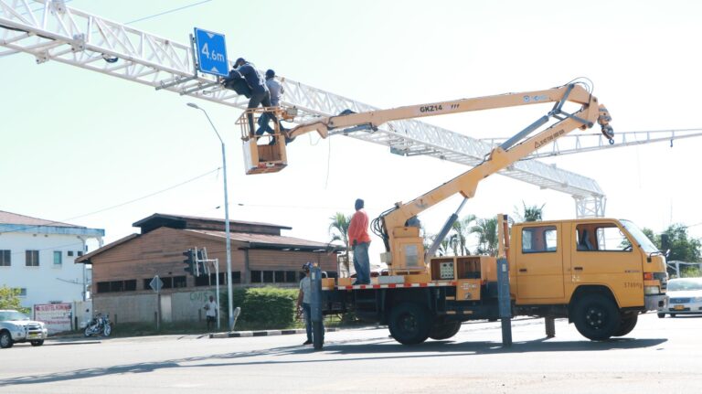 De constructie waaraan de verkeerslichten zijn bevestigd op de hoek van de Van ’t Hogerhuysstraat en de Slangenhoutstraat wordt verwijderd, nadat deze door zware transporten was aangereden afgelopen maandag en donderdag, zo meldt de Communicatie Dienst Suriname.