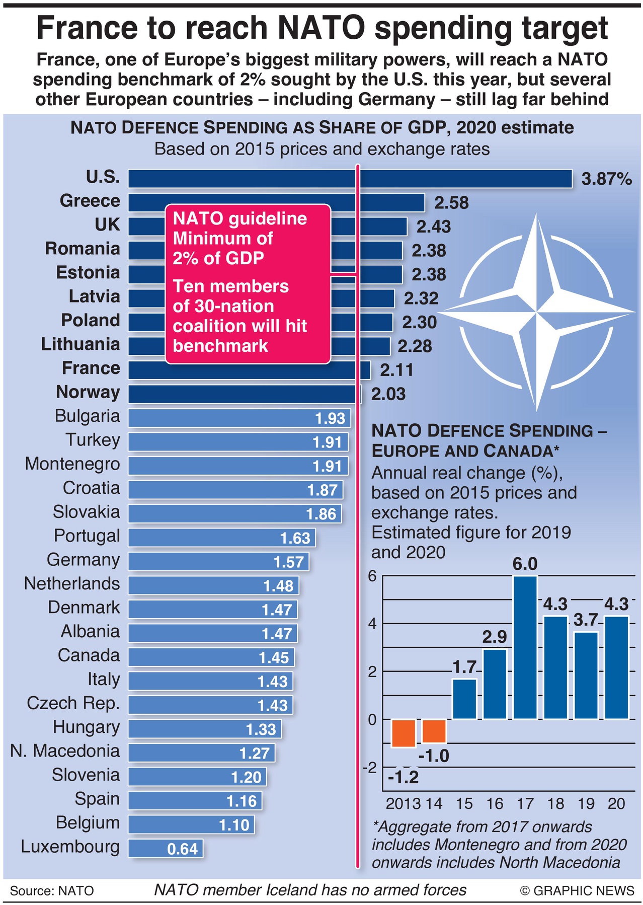 While France was joined by Norway for the first time in reaching 2%, despite the coronavirus crisis that has sapped economies, only 10 of the 30 allies will hit the target this year, including the U.S.