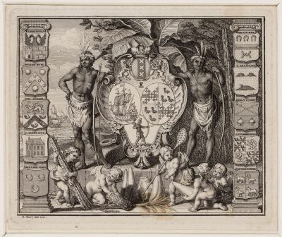 Koloniale zinnebeelden zijn nooit erkend. Een beeld, waarop ‘een neger’ met tabaksbladen als schildhouder voorkwam, werd afgewezen. Er was sprake van een papegaaitje als zinnebeeld bij het slaan van suikerpenningen. Toen kwam het driehoekige zegel van de Geoctrooieerde Sociëteit van Suriname, bestaande uit de verenigde wapens van de aandeelhouders: Amsterdam, de West – Indische Compagnie en de familie Van Aerssen van Sommelsdijck. Tussen de twee onderste schilden bevond zich het monogram SS (Sociëteit Suriname) en daaronder een boogschietend Indiaantje op grasgrond. Schildhouders waren twee Indianen, gewapend met pijl en boog. Het parool ‘Justitia Pietas Fides’ voltooide het geheel.