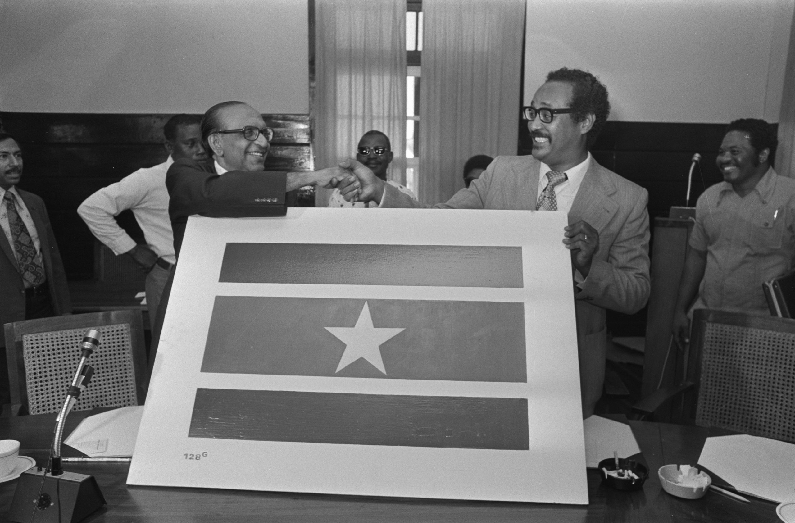 In 1954 werd de status van Suriname als kolonie veranderd in die van Nederlands Overzees Gebied. Dat ging gepaard met een eigen Surinaamse vlag. De vijf sterrenvlag van 1959 – 1975 duidt op de vijf grootste bevolkingsgroepen naar huidskleur aan. De zwarte ster staat voor de Creolen, de bruine voor de Hindoestanen, de gele voor de Chinezen, de rode voor de Inheemsen, en de witte voor de Europeanen. De sterren waren verbonden door een zwarte band als eenheidssymbool. De witte achtergrond stond voor vrede.