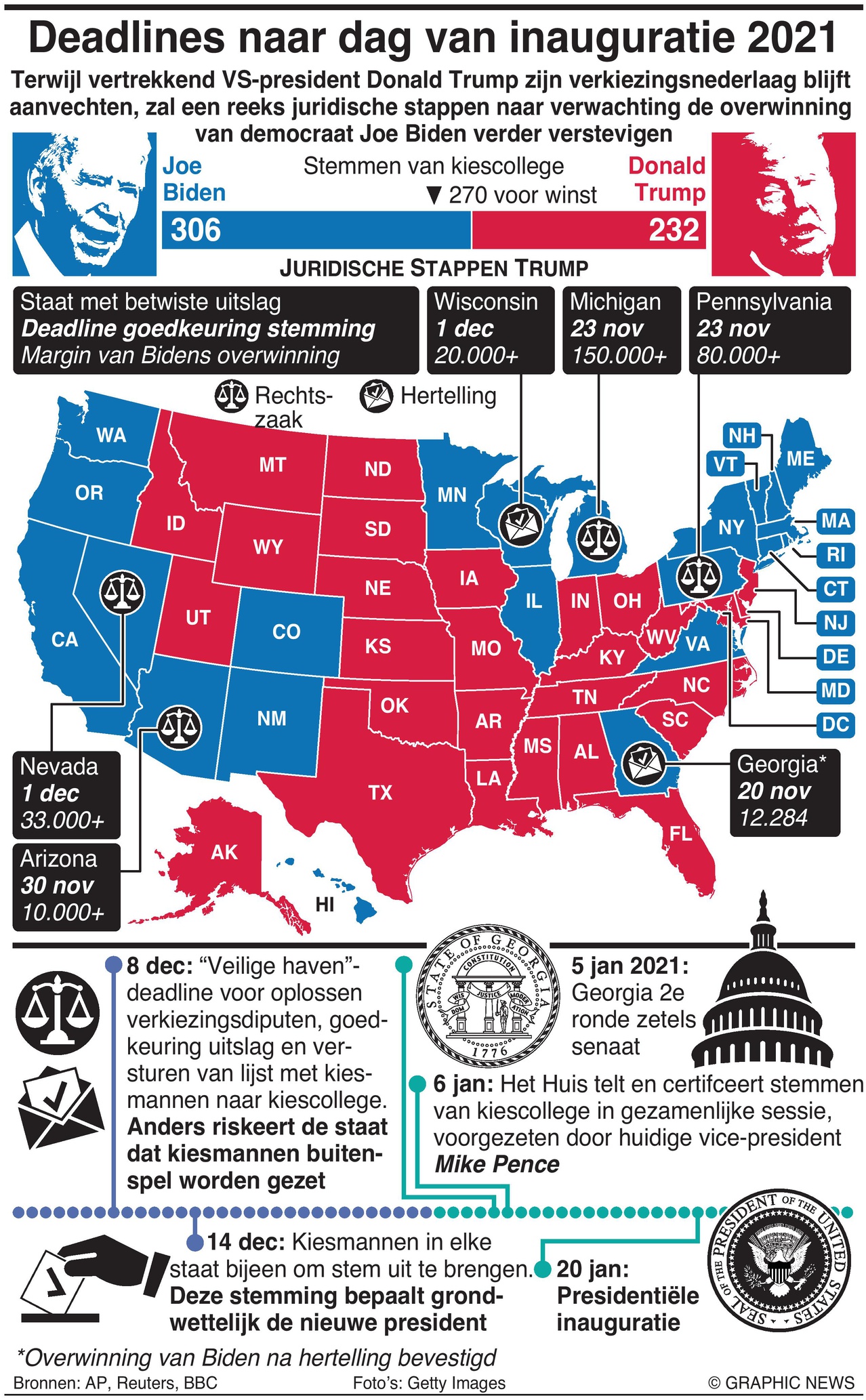 Biden leads by 306 electoral votes to Trump’s 232 as states work to certify their results at least six days before the Electoral College convenes on Dec 14.
