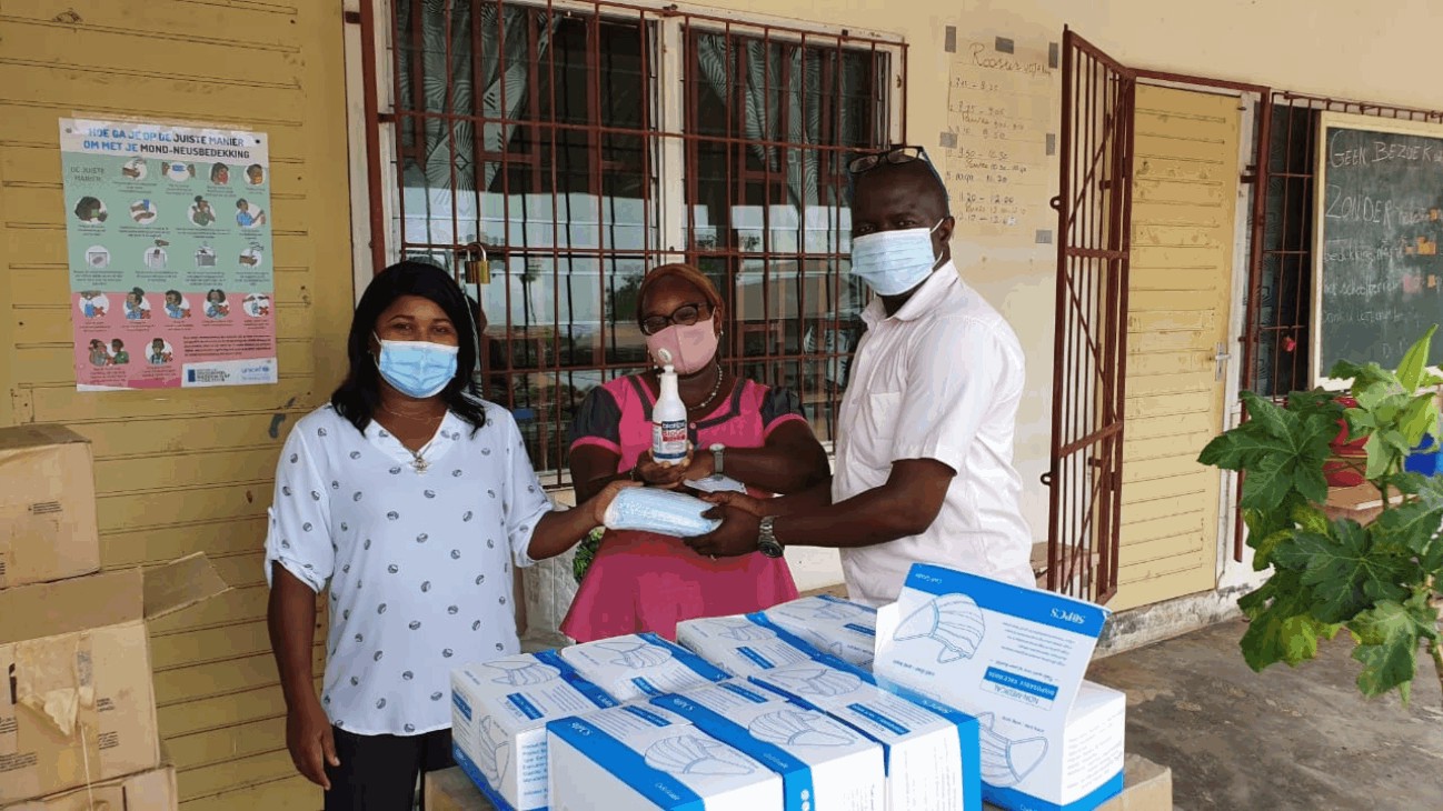 300 handsanitizers en 400 mondkapjes overhandigd aan het schoolhoofd van VOJ-Albina.