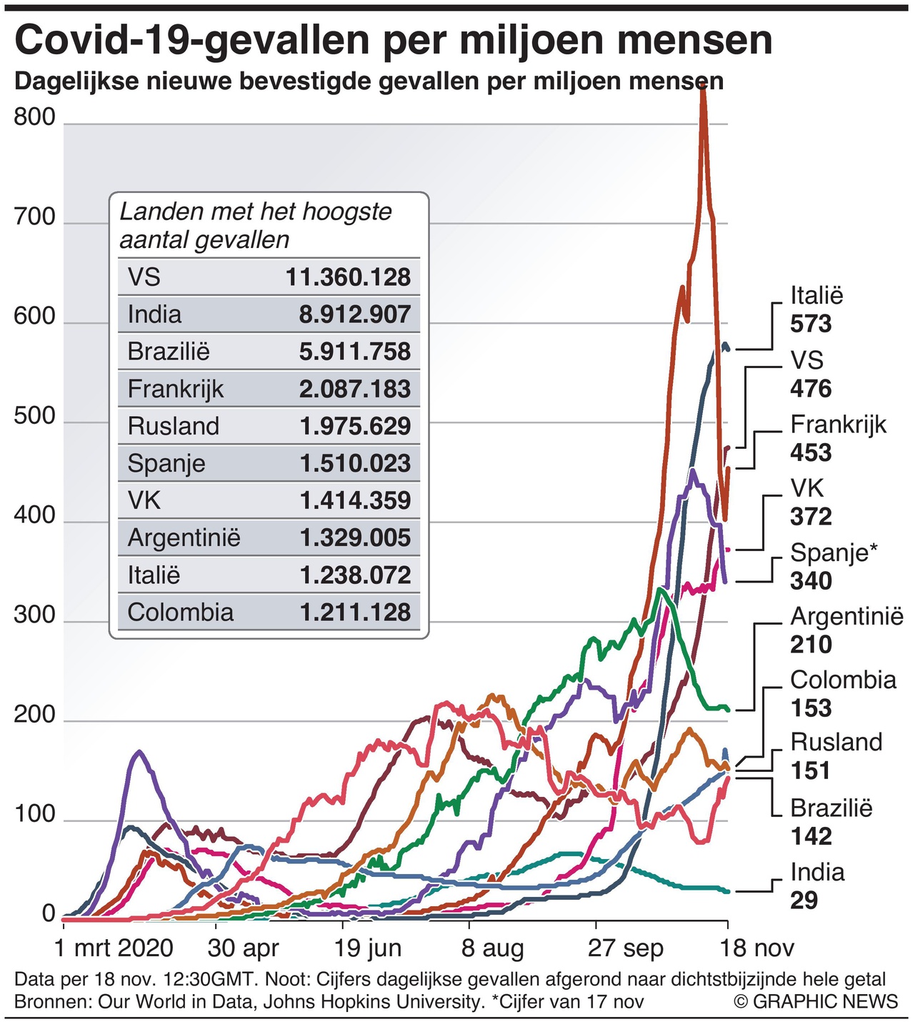 As rising coronavirus cases trigger second lockdowns around the world, we show how many new daily cases per million people the nations with the highest total cases have.