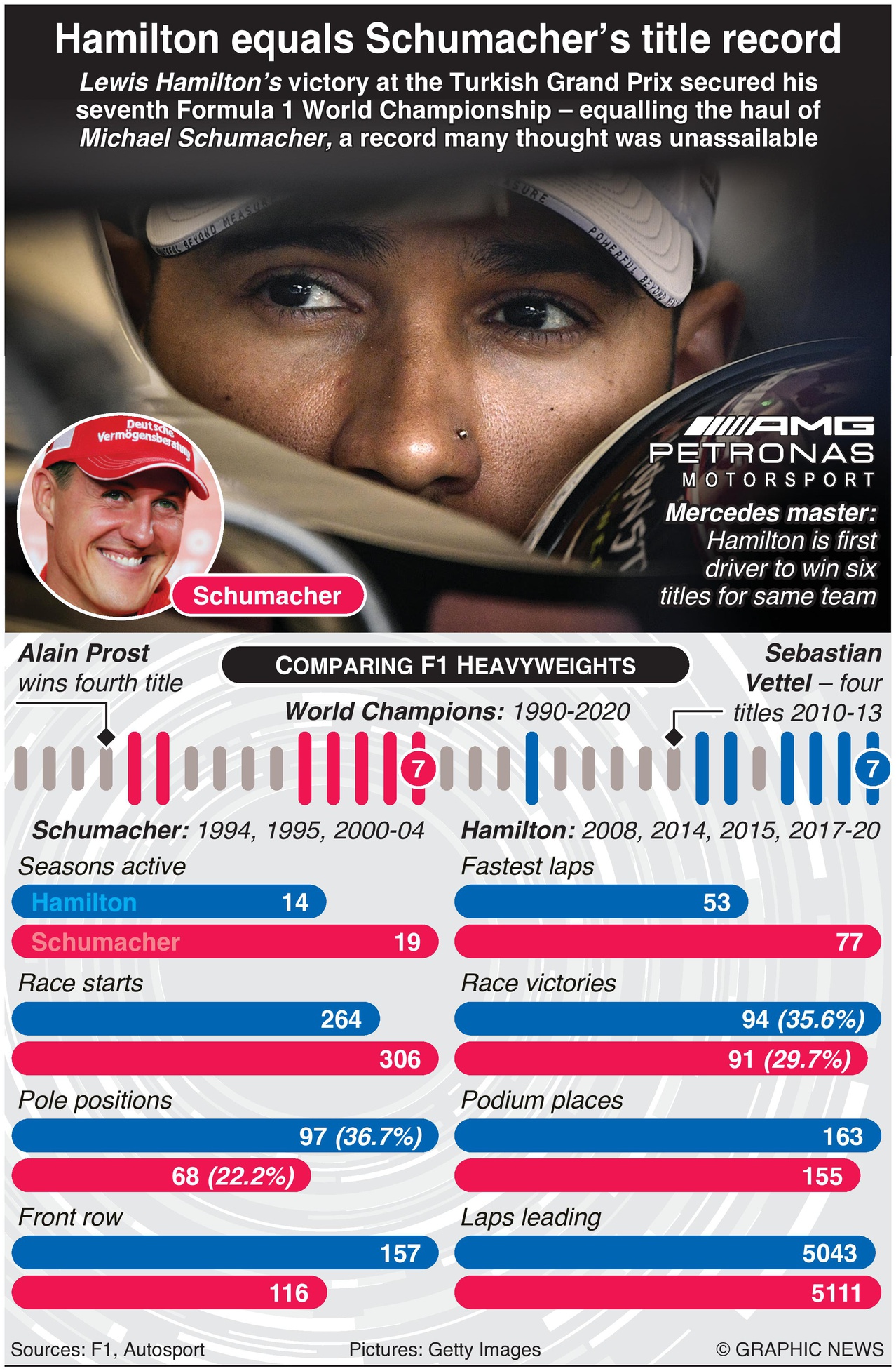 November 16, 2020 – Lewis Hamiltonās victory at the Turkish Grand Prix secured his seventh Formula 1 World Championship title, equalling the haul of Michael Schumacher, a record that many thought was unassailable.