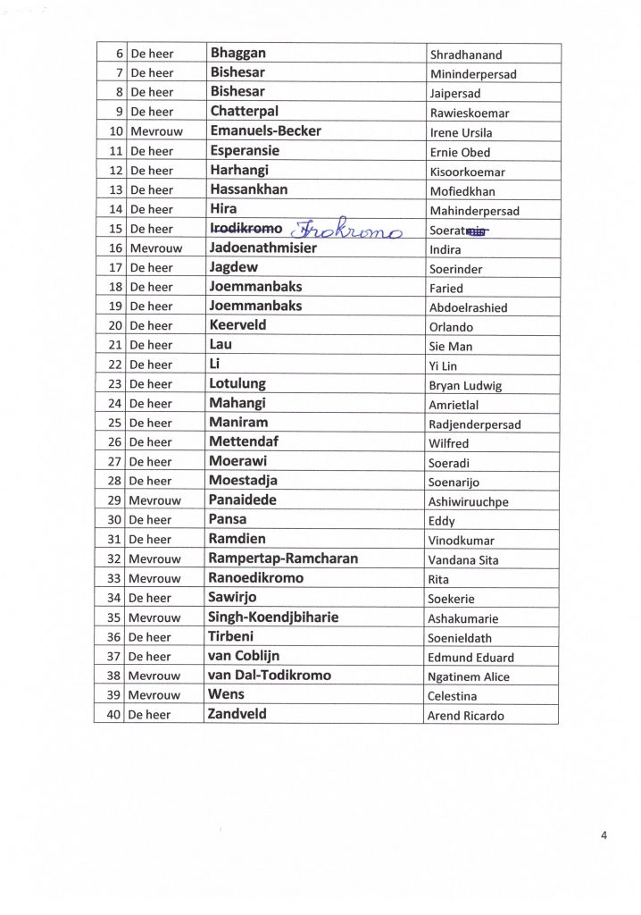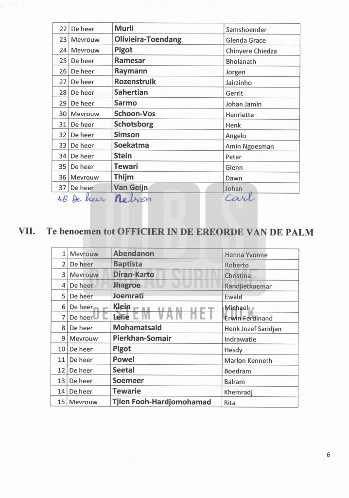 Onderstaand de lijst met namen van personen die werden gedecoreerd.Diverse Surinamers zijn afgelopen zaterdag gedecoreerd door president Chandrikapersad Santokhi vanwege hun bijzondere verdiensten voor ons land. Ex-president Ronald Venetiaan ontving de hoogste onderscheiding, Drager van het Groot Lint in de Ere Orde van de Gele Ster. In totaal werden 192 personen gedecoreerd,