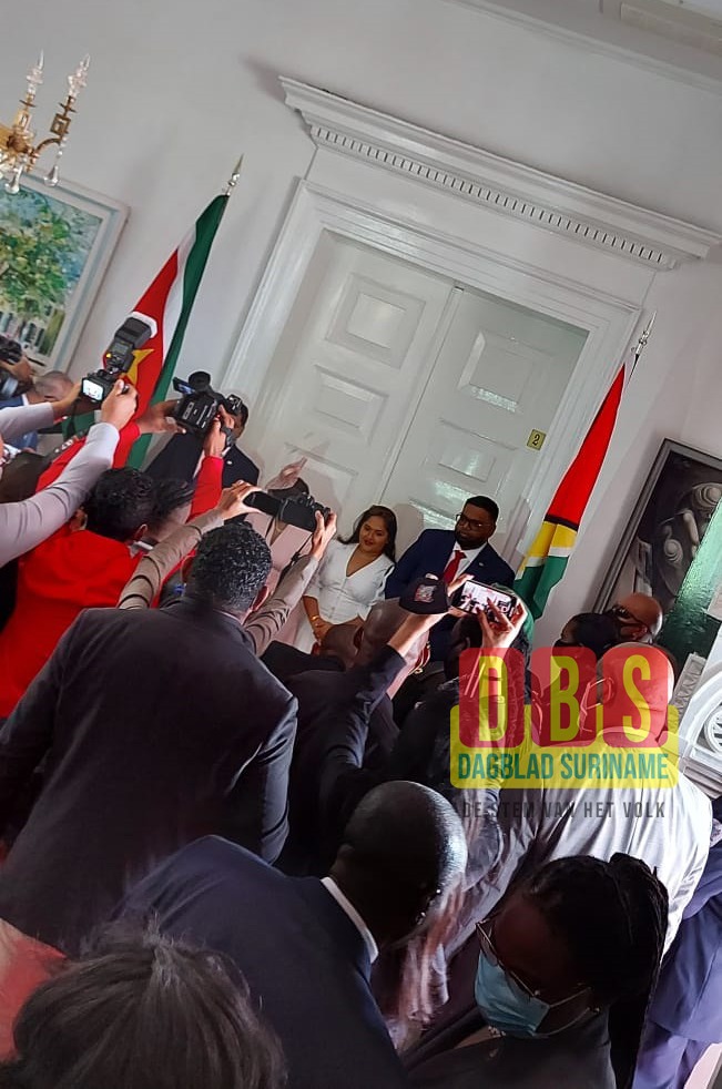 De president van Guyana, Irfaan Ali, is dinsdagochtend door president Chandrikapersad Santokhi officieel ontvangen in het presidentieel paleis.