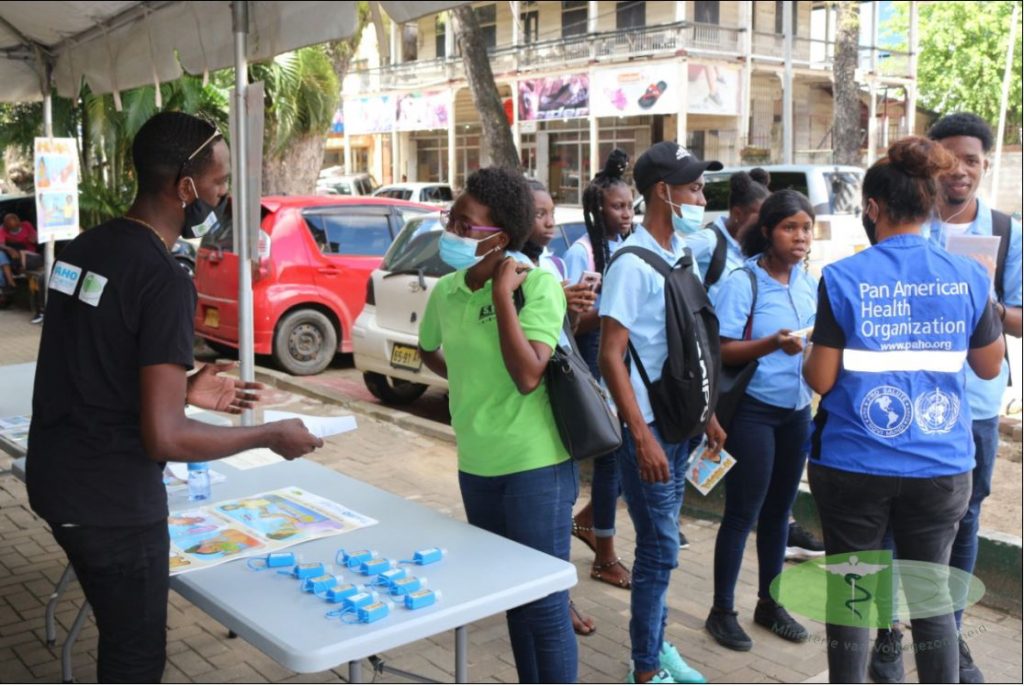 Een team van de afdeling Voorlichting van het ministerie van Volksgezondheid was dinsdag in de binnenstad van Paramaribo om mensen van informatie te voorzien over de Covid-19 maatregelen.