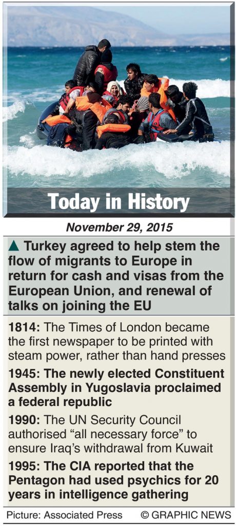 November 29, 2015: Turkey agreed to help stem the flow of migrants to Europe in return for cash and visas from the European Union, and renewal of talks on joining the EU